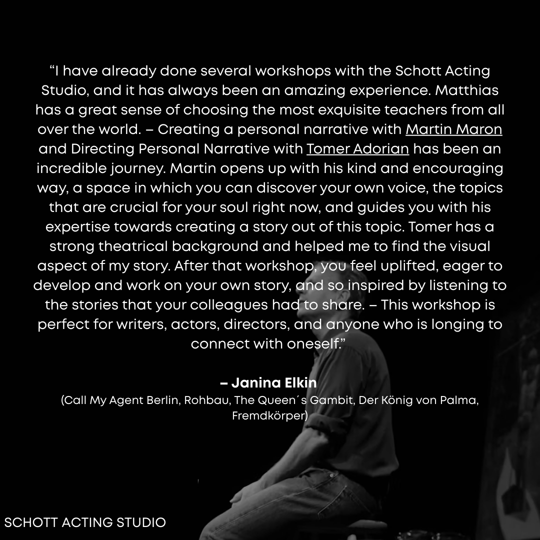 “I have already done several workshops with the Schott Acting Studio, and it has always been an amazing experience. Matthias has a great sense of choosing the most exquisite teachers from all over the world. – Creating a personal narrative with Martin Maron and Directing Personal Narrative with Tomer Adorian has been an incredible journey. Martin opens up with his kind and encouraging way, a space in which you can discover your own voice, the topics that are crucial for your soul right now, and guides you with his expertise towards creating a story out of this topic. Tomer has a strong theatrical background and helped me to find the visual aspect of my story. After that workshop, you feel uplifted, eager to develop and work on your own story, and so inspired by listening to the stories that your colleagues had to share. – This workshop is perfect for writers, actors, directors, and anyone who is longing to connect with oneself.” –